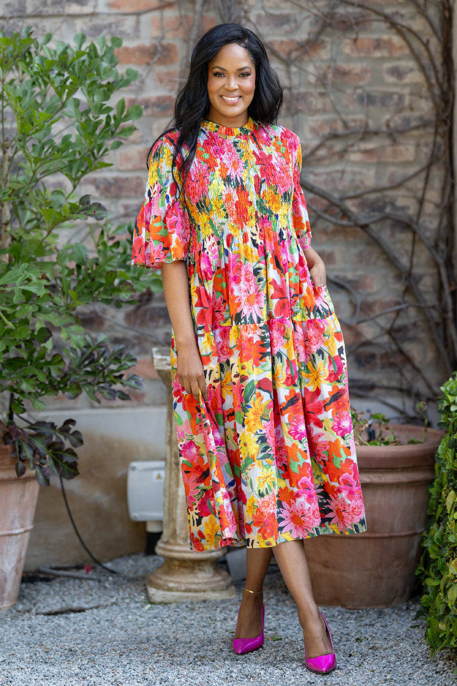 Make a bold, beautiful statement with the Bloom Burst Dress, a joyful celebration of color and floral charm. Featuring a stunning pink multi-color floral print, this dress is designed to brighten any day with its fresh energy and feminine silhouette.